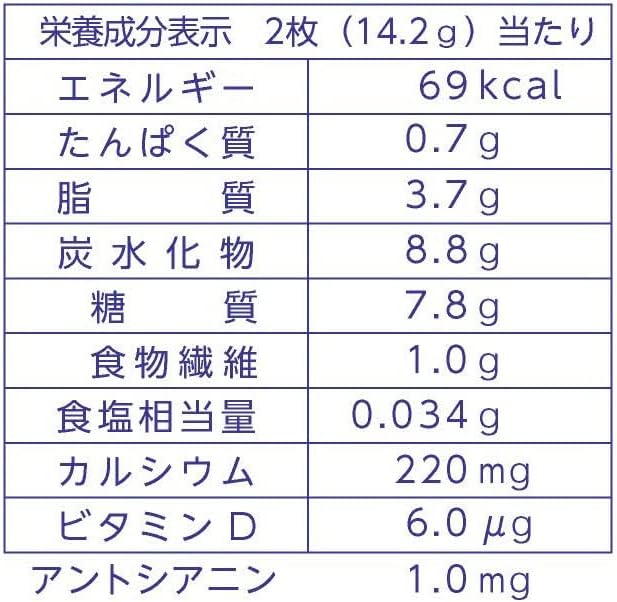 Amazonマーケットプレイス保証は、出品者が販売および発送する商品をご購入の場合に適用されます。Amazonマーケットプレイス保証は、購入された商品のコンディションや配送を保証するものです。 内容量:40枚 カロリー:3枚(21.3g)あたり105kcal 原材料:小麦粉(国内製造)、植物油脂、ブドウ糖、砂糖、難消化性デキストリン、乳糖、卵、食塩、澱粉、ビルベリーエキス粉末/卵殻Ca、乳化剤(大豆由来)、香料、酸味料、着色料(アカビート)、膨張剤、ビタミンD 原材料に含まれるアレルギー物資:小麦、卵、乳、大豆 商品サイズ(高さ×奥行×幅):310㎜×40㎜×205㎜