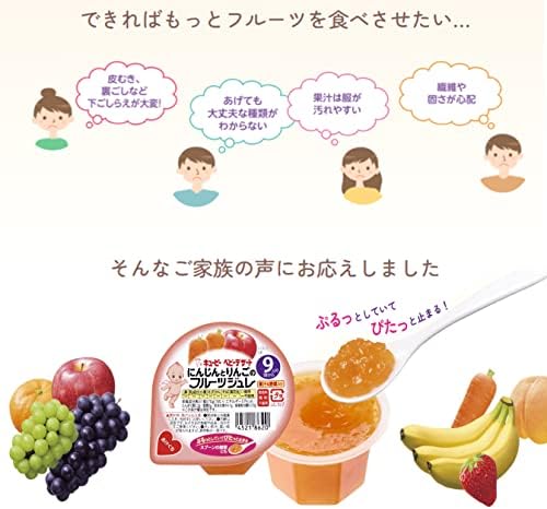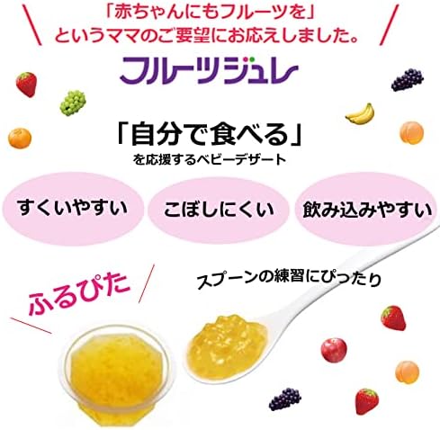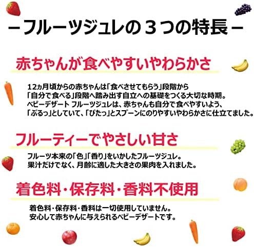 Amazonマーケットプレイス保証は、出品者が販売および発送する商品をご購入の場合に適用されます。Amazonマーケットプレイス保証は、購入された商品のコンディションや配送を保証するものです。 原材料:いちご、砂糖・ぶどう糖果糖液糖、ぶどう果汁、砂糖、ゲル化剤(増粘多糖類)、クエン酸、リン酸カルシウム 商品サイズ(高さx奥行x幅):219mmx73mmx75mm 内容量:70g×6個 着色料・保存料・香料不使用月齢に適した大きさの果肉入り フルーツや野菜のおいしさに出会い、自分で食べることを学ぶベビーデザートです。