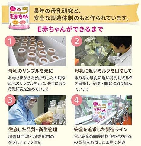 原産国:日本 【0ヶ月の新生児~1歳頃までのベビーミルク】E赤ちゃんは、全国の産婦人科でも使われている粉ミルクです。離乳食にも活用できます。※ミルクを作る前には、手を洗い、器具(哺乳瓶や、哺乳瓶ブラシなど)は消毒して使いましょう。専用のスプーンで正確にはかりましょう。1回ごとに調乳して飲ませてあげてください。作り置きや飲み残しは与えないでください。 【特長1】栄養成分の量とバランスを母乳に近づけている他、ミルクの全てのたんぱく質を細かく分解してペプチドにしています。赤ちゃんの消化負担を母乳と同じくらいまで減らしているので、心配せずにして飲ませることができます。 【特長2】初乳に多く含まれ、ビフィズス菌のような良い菌を守る「ラクトフェリン(消化物)」、母乳育ちのような腸内環境に近づける、3種類のオリゴ糖を配合しています。オリゴ糖の種類を増やすと、赤ちゃんのおなかのビフィズス菌もさらに増えます。育児用ミルクにラクトフェリン・3種類のオリゴ糖を配合しているのは、森永だけ。※日本国内で販売されている乳児用調製粉乳中、2020年4月現在 森永乳業㈱調べ 【特長3】乳幼児の発達に重要なDHA・アラキドン酸を、日本人の母乳に含まれる配合(2:1)と同じ比率で配合しています。