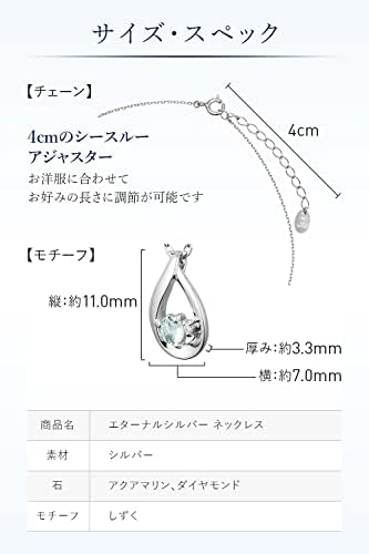 【人気のしずくモチーフ】流れるような心地よいラインは、美しい存在感で身に着ける女性のこころに潤いをもたらします。人気のしずくモチーフにアクアマリンとダイヤモンドが煌めき、清楚で上品な印象のネックレスです。※天然石を使用しているため、実際の色味や風合いが異なる場合がございます。 【4℃エターナルシルバー】 4℃だけの特殊な製法でつくられた変色がおこりにくいオリジナルのシルバー。4℃のエターナルシルバーは時を経ても美しい輝きを放ち続けます。 【厳しい品質基準】4℃独自の品質基準を定め、すべてのジュエリーを徹底的に検査。さらに経験豊富な検品のプロフェッショナルたちが一点一点手に取りながら厳正なチェックを行っております。 【プレゼントに最適】お渡しの際に便利なSHOP袋、ジュエリーケース付。大切な方へのプレゼントにもご対応いただけます。 ※付属品の仕様(デザイン)は予告なく変更になる場合がございますので、予めご了承ください。 【WEBサイト用取扱い説明書兼保証書付】WEBサイト用取扱い説明書兼保証書もお付けしております。 【仕様】[チェーン] 42cm( 38cm / シースルーアジャスター 4cm) [モチーフ] 縦 約11.0mm × 横 約7.0mm × 厚み:3.3mm - 23,110位ファッション ( ) - 74位