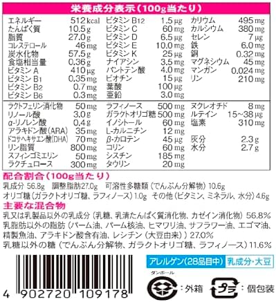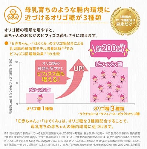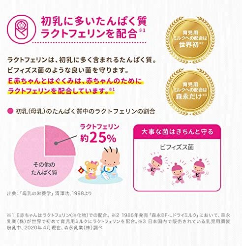 原産国:日本 【0ヶ月の新生児~1歳頃までのベビーミルク】E赤ちゃんは、全国の産婦人科でも使われている粉ミルクです。入れかえタイプで400gごとに小分けパックされた「エコらくパック」、たっぷり使える「大缶」、母乳と混合の方に便利な「小缶」、お出かけや夜間の調乳にも便利な「スティックタイプ」をラインアップ。離乳食にも活用できます。※ミルクを作る前には、手を洗い、器具(哺乳瓶や、哺乳瓶ブラシなど)は消毒して使いましょう。専用のスプーンで正確にはかりましょう。1回ごとに調乳して飲ませてあげてください。作り置きや飲み残しは与えないでください。 【特長1】栄養成分の量とバランスを母乳に近づけている他、ミルクの全てのたんぱく質を細かく分解してペプチドにしています。赤ちゃんの消化負担を母乳と同じくらいまで減らしているので、心配せずにして飲ませることができます。 【特長2】初乳に多く含まれ、ビフィズス菌のような良い菌を守る「ラクトフェリン(消化物)」、母乳育ちのような腸内環境に近づける、3種類のオリゴ糖を配合しています。オリゴ糖の種類を増やすと、赤ちゃんのおなかのビフィズス菌もさらに増えます。育児用ミルクにラクトフェリン・3種類のオリゴ糖を配合しているのは、森永だけ。※日本国内で販売されている乳児用調製粉乳中、2020年4月現在 森永乳業㈱調べ 【特長3】乳幼児の発達に重要なDHA・アラキドン酸を、日本人の母乳に含まれる配合(2:1)と同じ比率で配合しています。 【入れかえタイプの粉ミルク エコらくパック】エコらくパックは、ミルク入りの袋を手で開けて、専用ケースに袋ごと入れるだけ。専用ケースは四角くてコンパクトサイズだから収納にも困りません。また、開け口が広いからミルクをすくいやすく、調乳もらくらく。使い終わったミルクは袋を丸めて捨てるだけなので、缶よりもゴミ捨てが簡単です。缶と比べて、製造時のCO2排出量も少ないので、とってもエコなミルクです。まずは専用ケース・スプーン付きの「はじめてセット」。2回目からは「詰替用」をお使いください。