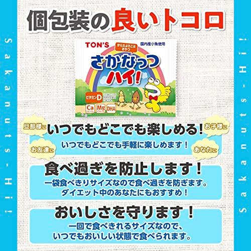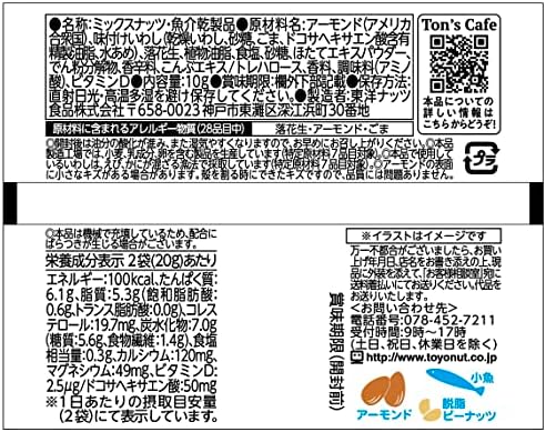 内容量:10g×30袋 カロリー:55kcal 原材料:アーモンド、いわし、落花生、砂糖、植物油脂、食塩、ゴマ、水あめ、魚介パウダー、ドコサヘキサエン酸含有精製魚油、こんぶパウダー、香辛料、トレハロース、香料、調味料(アミノ酸等)、ビタミンD、 (原材料の一部にエビ、大豆を含む) 商品サイズ(高さx奥行x幅):100.0mm×180.0mm×150.0mm
