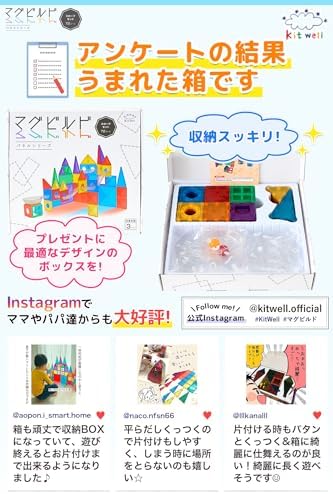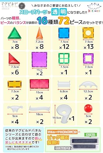 マグビルド パネルシリーズは日本語の説明書が付属しており、男の子、女の子、子どもから大人までこの磁気おもちゃを楽しめます。楽しみながら学ぶドリルで3歳、4歳、5歳、小学生と長い期間お役立て頂けます しっかりとした磁力を持ちながら、お子様が指を挟んでも痛くならない安全仕様。万が一、口に入れても安心のABS素材を使用した磁石おもちゃ。日本の食品検査に合格しています。ひらめきの力を育む知育玩具です 安全性が評価され、人気ランキング急上昇!保育園、幼稚園、幼児教室、キッズ スペースへの納入も多数あり、お誕生日、入園祝い、入学祝い、クリスマスなどの プレゼント、ギフト、贈り物に選ばれています! 正三角形・二等辺三角形・正方形・長方形の多彩な6色のパーツに、ボールとスロープが追加!自分だけのビーズコースターを作ろう!子どもも大人も楽しく遊べる全16種類72ピースの 玉の道 磁石ブロックの決定版 面でできた磁石ブロックを磁力でくっつけたり離したりする感触を楽しみながら、面や立体、磁気の構造、展開図を自然と理解出来るようになります。プラスティックが透明で内部構造が理解しやすくなっています。