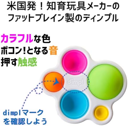 アメリカ発 知育玩具メーカーFat Brain Toys (ファットブレイントイズ) 社の赤ちゃんおもちゃ Dimpl (ディンプル)。カラフルな丸いシリコンをポコン! と押して、赤ちゃんの指先を刺激してあげましょう。 0歳児の歯固めにもピッタリ!おうちではもちろん、車の中、外出先でも大活躍するカラフルなベビートイです。 BPA (ビスフェノールA) フリーなので、あかちゃんが舐めたり噛んだりしても安全安心な素材でつくられています。 出産祝いやお誕生日プレゼントなど、贈り物にも喜ばれる生後10ヶ月から使えるベビーおもちゃです。 パッケージサイズ : 約 幅 15.5cm x 高さ 16.5cm x 奥行 5cm / 本体サイズ (最長部) : 約 横 15cm x 縦 13cm / 対象月齢 : 10ヶ月以上