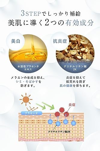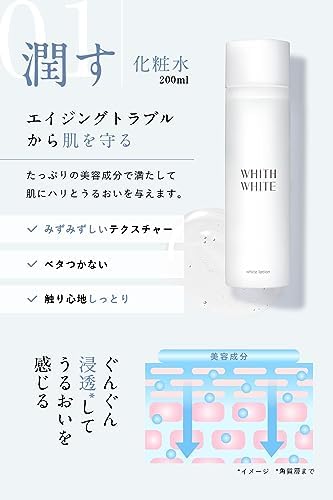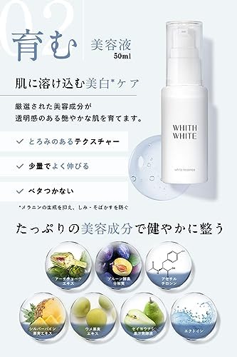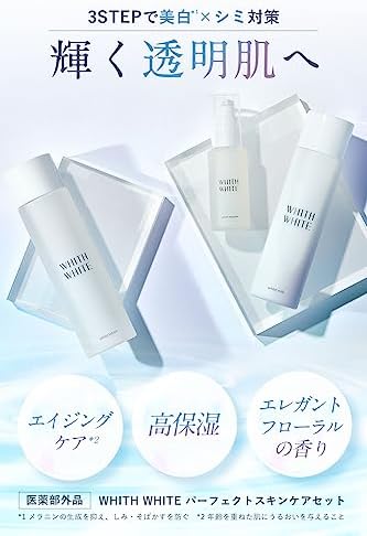 🌞【 3STEP贅沢 セット 】 WHITH WHITE の スキンケア 商品から 美白 ケア を徹底的に求める方へ 薬用 基礎 化粧品 「 化粧水 200ml」「 美容液 50ml」「 乳液 150ml」の3商品を セット に。 🌞【 シミ 対策 】厚生労働省認可の 有効成分 を2種配合た 医薬部外品 の3商品 。メラニンの生成を抑え、シミやそばかすを防ぐ「 水溶性 プラセンタ エキス 」& ニキビ などの皮膚トラブルを抑え、肌を健康に保つ「 グリチルリチン酸2K 」で 美肌 を目指します。 🌞【 目覚める、みずみずしい透明感 】乾燥 、ごわつき、 キメ の乱れなど、多くのゆらぎを感じる 肌 に植物のみずみずしさを深くチャージし、澄んだ 透明感 を。 🌞【 エレガントフローラルの 香り 】みずみずしく爽やかな「レモン・リーフグリーン・フォレストグリーン」のトップノートに、優美で魅力的な「ミュゲ・ローズ・ジャスミン」のミドルノートが融合します。ラストノートは「ムスク・イリス・クローブ」と華やかで優しいい香りへ移ります。 🌞【 使用方法 STEP1 】 洗顔 などでお肌を清潔にした後、 化粧水 を適量(500円玉サイズほど)手に取り、顔の中心から外に向かって肌をやさしくおさえるようになじませます。両手で顔全体を包み込み、肌をプレスするようによくなじませます。【 使用方法 STEP2 】 化粧水で肌を整えた後、 美容液 を適量(1~2プッシュほど)手に取り、顔の下から上にむかって、肌に塗り広げて、なじませます。両手で顔全体を包み込み、肌をプレスするようによくなじませます。 【 使用方法 STEP3 】美容液後、 乳液 を適量手に取り、顔の中心から外に向かって肌をやさしくおさえるようになじませます。両手で顔全体を包み込み、肌をプレスするようによくなじませます。 - 1,866位ビューティー ( ) - 3位