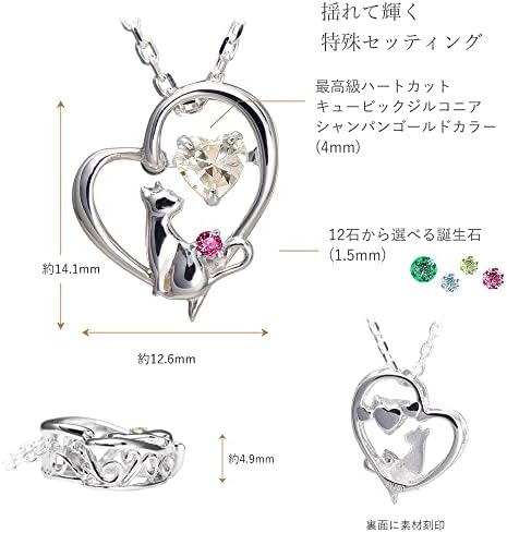 お好みの誕生石が選べる、今大人気のレディース用、ネコモチーフネックレス。キュートなネコとキュートなハートの相性はバツグン!立体的な構造になっているため、正面からも斜めから見ても胸元を際立立てます。しっぽの部分と誕生石で形成される隠れハートも特徴! ネコの上部には動くたびにキラキラ煌めく、ハートカットの最高級ジルコニアダンシングストーンを使用しております。お色は女性から絶大な人気を誇るシャンパンゴールドカラー。眩い光に輝く人気のレディースネックレス。自分へのご褒美にも大切な方へのプレゼントにも大変喜ばれる商品です。 本体 縦×横×厚み(mm) :約14.1×約12.6×約4.9 素材:シルバー/キュービックジルコニア シャンパンゴールドカラー(4mm)/誕生石(1.5mm)※天然石を使用しているため、色味などに個体差がある場合がございます。 重量(g):約2.4g     チェーン :シルバー925カットアズキチェーン 約40cm - 152,617位ファッション ( ) - 1,488位