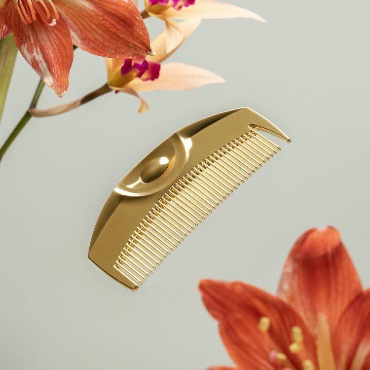 純金を使い最もやさしく高機能なトップシリーズ。お出掛け時の携帯用にもおすすめ。 【サイズ / 重さ】:W100 x H46 x D9 mm / 約17.0g 【極めてなめらかな表面加工】:日本の工業技術「JP CHROME-TECH」により、滑らかな表面加工が接触摩擦を最小限に留め、髪へのダメージを削減します。さらに、微細な空洞をふさぎ、汚れもつきにくくなっています。 【静電気を拡散】:特殊表面加工により、静電気を吸着し拡散。静電気による髪の広がりを抑え、さらに急な放電による枝毛の発生を抑えます。通常のブラッシングと比べ最大70%以上のダメージを軽減(当社比) 【球状の先端と超軽量】:高い技術により製品化された球状の先端により、地肌をダメージからやさしく守ります。さらに毎日お使いいただく櫛だから、圧倒的な軽量性と強度を実現。 - 2,863位ビューティー ( ) - 9位