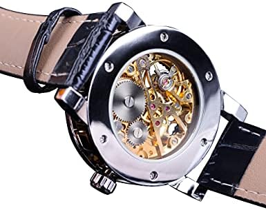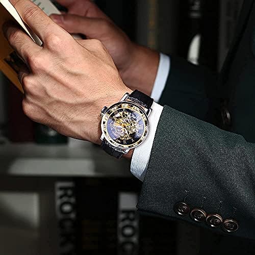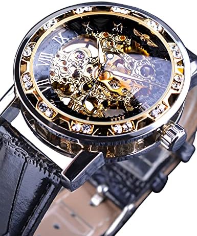Winner レトロ マニュアル 機械式 スケルトンウォッチ ダイヤモンドとカービング フラワー クラフト メンズ スケルトン 腕時計 機械式 クラシック ローマ数字, ブラックゴールド。, スケルトンウォッチ。