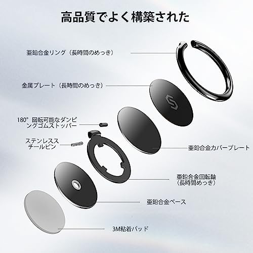 【強力な吸着力】強力な3M VHB粘着パッドがしっかりとスマホに吸着(耐荷重5kg)し、思わぬ落下を防ぎます。ご注意:1. 商品の表面に傷がある原因:リングの背面には青ビニールテープが貼られています。傷は薄い膜に付いていますので、使う時は外してください。2. 背面ガラスのケース:付属の静電ステッカーを貼ってからご使用ください。 接着力は他の素材よりも弱くなります。取り付けてから24時間は、スマホリングを使用しないでください。3. 凹凸のある表面、シリコーン、ゴム、皮革、コーティングガラスでの使用は推奨しません。 【360度回転】360°回転のベースと180°動くリングで、好きな角度で画面をみることができます。6,000回折りたたんでもリングが緩まないテスト済み。ベース内部に金属を採用し、マグネット式のカーマウントにも取り付け可能です。 【落下防止・片手操作】混雑したバスや電車の中でも片手で簡単にスマホを持つことができ、思わぬ落下を防ぎます。また、スマホで映画をみるとき、音楽を聴くとき、化粧やビデオ通話、ゲームで遊ぶときに、デスクやキッチン、テーブルにスマホを立てるスタンドとしてもお使いいただけます。 【対応機種】iPhone 15 / 15 Pro / 15 Pro Max / 15 Plus / 14 / 14 Plus / 14 Pro / 14 Pro Max / iPhone13 / 13pro / 13ProMax / 13mini / iPhone12 / 12pro / 12ProMax / 12mini / iPhone XS Max / XR / X / 8 / 8 plus / 7 / 7 plus / 6 / 6 plus / 5 / 5S / 5C / SE, Samsung Galaxy S10 / S9 / S8 / S7 / S6, Note 6 / 5, LG, Sony, Nexus, Nokia, Google Pixel, その他のAndroid端末など、様々な4〜8インチのスマートフォンでご利用いただけます(ワイヤレス充電非対応)。 【しっかりサポート】安心してご利用いただくために、万が一品質に問題が発生した場合、弊社にご連絡いただければ迅速に対応いたします。