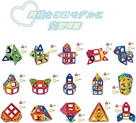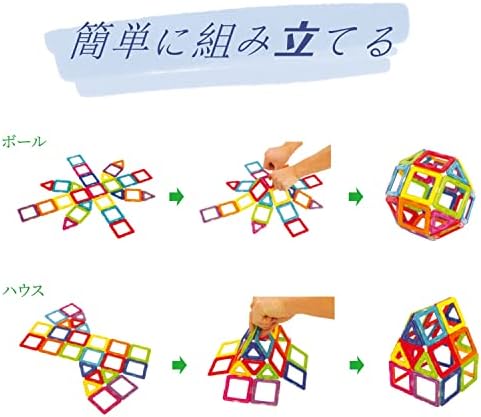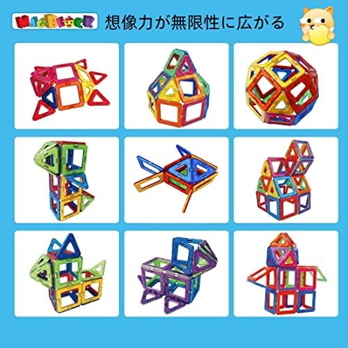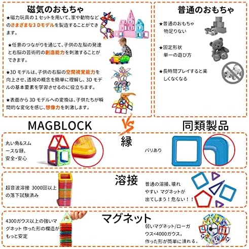 【安全・安心】MAGBLOCKマグネットブロックは、安全で信頼性の高い知育玩具であるABS樹脂で作られています。CE承認、CPC(Children's Product Certificate)EN-71、ASTM(アメリカの基準)、JFSL 370(食品衛生法に基づく食品、添加物等の規格基準)認定済み。 【収納が簡単】使わないときは収納ボックスに入れておけば、家を清潔に保つことができます。 お子様の収納習慣を養うだけでなく、お出かけの際に持ち運びにも役立ちます。 【2Dから3Dへのおもちゃ】磁気玩具で遊ぶことで、子どもたちの創造性や色や形を認識する能力を養い、子どもたちの想像力や問題解決能力を高めることができます。 子供の脳の発達を促進し、子供の身体的および精神的発達を助けます。 【プレゼントに最適】楽しく遊びながら学ぶことができるため、お子様の成長を自然に促すことができます。 お子さまやお孫さまへのお誕生日プレゼントや、帰省されたお孫さんへのプレゼント、クリスマスプレゼント、入園・卒園祝いなどのプレゼントにピッタリです。 【安心保証】商品の不具合、初期不良、ケース破損など、無料交換や返金など対応しております。ご安心して購入してください。商品に何かご疑問、不具合があれば、お気軽にご連絡ください。弊社はいつも迅速な対応をしております。