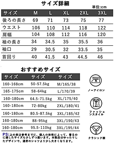 通気性に優れ、柔らかい肌さわりを与えてくれる。シンプルなデザインなのでどんなコーデにも合わせ易く、色々と着回し出来る色チ買いで欲しくなる1着。程よい厚みの生地は季節を問わず活躍してくれ、休日のカジュアルスタイルや、ビジネスにもハマる万能シャツ。 春夏秋冬も使える。春、秋は上着として着てもいいし、夏は袖を巻いてTシャツとして、冬は下着で使うことができる。男一人一人が欠かせない服装です。彼氏さんへの誕生日等のプレゼントにもお勧めです。 季節の変わり目にはライトアウターとして、冬場は更にコートを羽織ってレイヤードスタイルで。ロングシーズンで着回しやすく、着方によって大きく雰囲気を変えて。 Size【M】着丈:69cm 胸囲:104cm 袖丈:(56cm,长袖) 身高:160-165cm 体重:50-56.5kg【L】着丈:71cm 胸囲:108cm 袖丈:(57cm,长袖) 身高:165-170cm 体重:56.5-65kg【XL】着丈:73cm 胸囲:112cm 袖丈:(58cm,长袖) 身高:170-175cm 体重:65-75kg【2XL】着丈:75cm 胸囲:116cm 袖丈:(59cm,长袖) 身高:175-180cm 体重:75-85kg【3XL】着丈:77cm 胸囲:120cm 袖丈:(60cm,长袖) 身高:180-185 体重:85-95kg [宣言:]あなたが購入後30日以内に満足していないならば、我々は収益と払い戻しを提供します。 我々は数年間衣類を売っていました、しかしすべての製品が我々の店であるので、買うのを遠慮しなくしてください - 2,993位ファッション ( ) - 21位