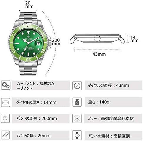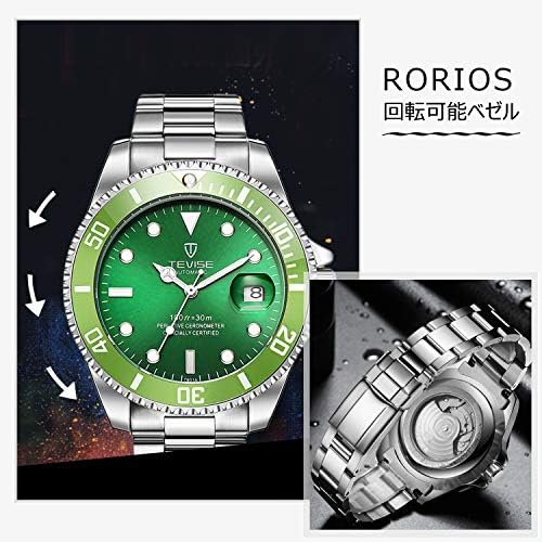 RORIOS 腕時計 メンズ腕時計 自動巻き 夜光 日付表示 うで時計 機械式時計 メンズビジネスウォッチ ステンレスバンド 防水 ウォッチ 紳士 時計 通勤 watch for men グリーンA