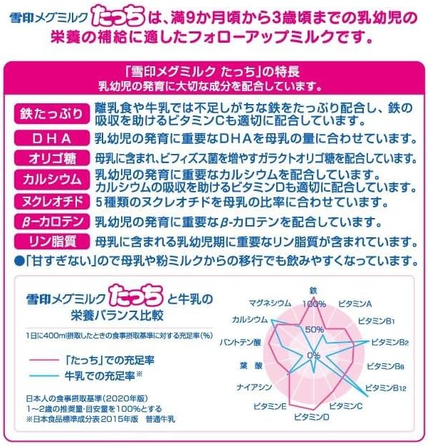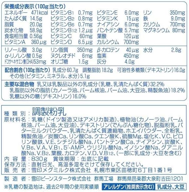 原材料:乳糖(ドイツ製造又はアメリカ製造)、植物油(カノーラ油、パーム核油、パーム油、大豆油)、デキストリン(でんぷん糖化物)、脱脂粉乳、バターミルクパウダー、乳清たんぱく質濃縮物、ホエイパウダー、全粉乳、精製魚油/炭酸Ca、リン酸Ca、クエン酸K、硫酸Mg、塩化K、V.C、ピロリン酸鉄、V.E、シチジル酸Na、パントテン酸Ca、ナイアシン、炭酸K、V.B6、V.A、V.B1、5'-AMP、ウリジル酸Na、イノシン酸Na、グアニル酸Na、V.B2、葉酸、カロテン、V.D、V.B12、(一部に乳成分・大豆を含む) 商品サイズ(高さx奥行x幅):18cm×13.2cm×13.2cm 内容量:830g