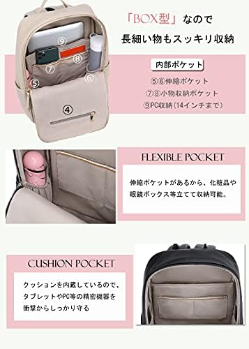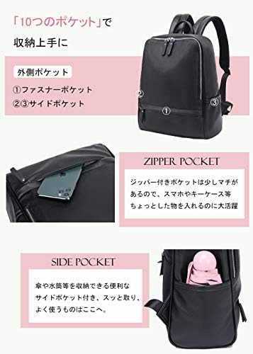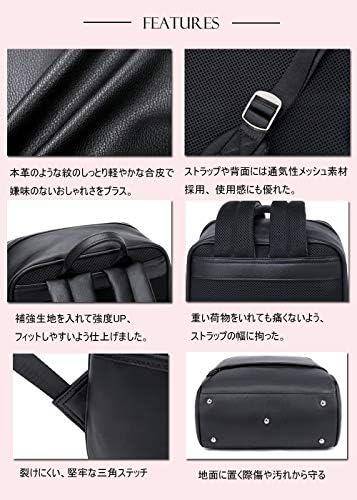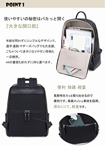 【大容量·通勤·軽量 レディース リュック】 大容量容量たっぷりで通勤に便利な軽量リュック。A4サイズにも対応し、雑誌やノートPCなどの荷物も余裕で収納可能です。 背面はクッション性のある通気性の高いメッシュ素材を使用しており、快適な背負い心地を実現しています。 合皮素材はしっとり軽やかでおしゃれさを演出し、防水性も備えています。 【パソコンが入るリュック】 上質な合皮 レザー素材を使用したキレイめな女性向けリュックサック。 パソコン収納スペースも備えられ、14インチ以下のノートPCもスマートに収納できます。 洗練されたデザインと防水性の組み合わせで、ビジネスシーンやカジュアルな場面にもぴったりです。 通勤に最適なコンパクトなリュックで、きちんとA4サイズが入る設計です。 軽量なので肩が痛くなりにくく、背面のクッション材と通気性の良いメッシュ素材が快適な使用をサポートします。 普通の革製リュックより軽量し、背負い心地も快適になります。 大容量ながら1泊2泊分の荷物が収納可能なバックパック。 A4雑誌や書類、タブレットやノートPC (14inch以内) はもちろん、ドリンクボトルやランチボックス、冷房対策の上着やひざ掛けなどのかさ張る荷物も全て収納可能。 合皮素材の上品なデザインと防水性が特長で、旅行や出張にも最適です。 本体サイズ:縦35X横29 X奥行14cm ショルダ一ストラップ長さ: 57~90cm ショルダ一ストラップ幅: 6cm 重さ:600g  どんな年齢の方にも似合うよう品のある、大人可愛いリュックデザインに仕上げました。 年齢を問わず、20代から40代、50代、60代、70代幅広い方にお使いいただけるデザインです。 ビジネスバッグとしても使えるデザインなので、働き盛りの世代から荷物の多い学生、ママさんまで幅広く活躍してくれます。 - 11,473位ファッション ( ) - 34位