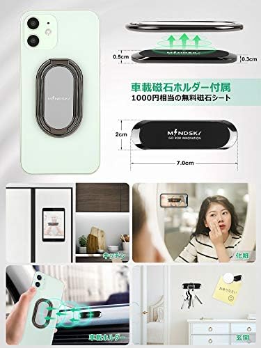 【MindSkyスマホリング新製品】 (スマホリング+スマホスタンド+車載ホルダー)機能スリーインワン,このスマホリングを購入することは、3つの機能(ring+holder+stand 3in1)を取得することと同じです。 【あなたに最適な角度】通常のスマホリングは比較的短いため、複数の角度を使用することはできません。弊社のスマホリングは、角度の問題を完全に解決します。360°回転のベースと180°回転第一リングと330°回転第二リングで、好きな角度を自由に調整できます。 【マグネットホルダー付き】市価1000円のマグネットホルダー付き。 車内のあらゆる平らな場所に貼り付けられます。面倒な工具は一切使用せず、テープを剥いで、どの平面でもシッカリと簡単に貼り付けます。 また、寝室、風呂場、オフィス、キッチン、冷蔵庫、玄関等あらゆる自宅で大活躍です。6つ強力磁石を内蔵して磁力が18倍になり、どんな不良な道に走ってもスマホをしっかり吸着でき、落下防止。 【強力な粘着力 薄型リング】このスマホリング小さくて薄い,収納に便利で、スペースをとらず、スマホとの一体感があります。ポケットに入れることができます。(5つの3Mステッカーが+透明フィルム付属)他のスマホに変更する場合は、古い3M接着剤をはがし、付属の3M接着剤を再度取り付けるだけで、他のデバイスに自由に貼り付けることができます。 【MindSky18ヶ月品質保証】このスマホリングはMindsky 直営店からご購入後18か月のアフターサービス期間があります、万が一何か不具合がございましたら、遠慮なく弊社にメールてご連絡くだいませ。お客様からのお問い合わせ内容に応じて無料代替品交換・返金可能です。スマホリングは高級磁石と亜鉛合金で構成されています。8000回の折り畳み試験を経て、工場出荷前の厳格な品質検査に合格しています。 - 11,369位家電&カメラ ( ) - 139位