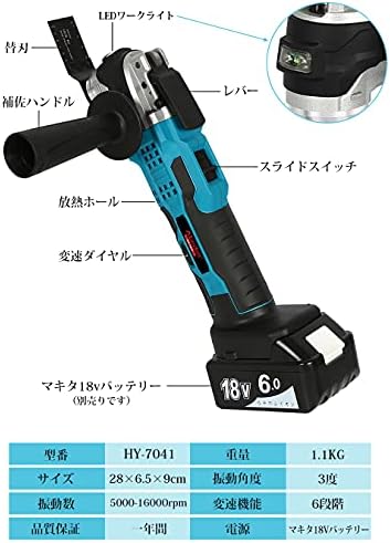 【商品仕様】■型番:マルチツール HY-7041 ■マキタ 18V バッテリー用 ■サイズ:(バッテリー抜き)約28×6.5×9cm ■本機重量:1.1kg ■振動角度:3度 ■最大回転数:5000-16000rpm ■ダイヤル6段階変速 【一台多役】 電動マルチツール替刃のみを交換することで、パイプ/釘の切断·Pタイルの剥離·タイル下地の研磨·錆落としなど色々な場合に対応出来ます。幅広い用途で細やかな作業、家庭DIYに大活躍!プロの方はもちろん、ご家庭でのプチリフォーム・補修用としても活躍しています! 【6段変速で作業楽々】変速ダイヤルを回して、作業内容や材料によって最適な速度が調整可能で、高精度作業が見込まれます。1段の回転数は5000r/minで最高の6段は16000r/minに達しています。 高速振り子振動で面一切断・ポケット切断が楽々。 【着装簡単&用途様々】替刃を着装・交換するのに、工具不要、スムーズに操作できて、レンチの必要もなく、作業中に替刃の変更が素早く安全に行うことができます。振動角度3°で、木材や石膏ボードはもちろん、釘や鉄筋などの金属、断熱材やゴムなどの柔らかい素材まで切断できます。木材の研磨はもちろん、タイルの目地削りなど細かい部分に便利です。さまざまな部材や、切断・剥離・研削作業に対応可能! 【梱包内容】マルチツール本体*1、補佐ハンドル*1、21枚替刃セット*1、日本語取説*1。※組み立て簡単で、どうぞ取扱説明書をよくお読みの上、製品を安全にお使いください。