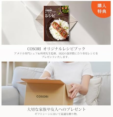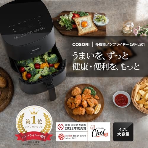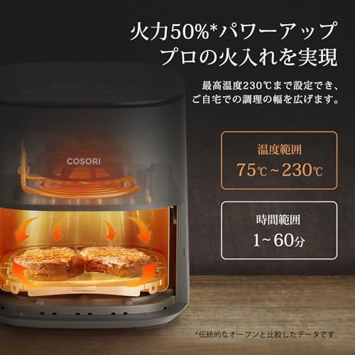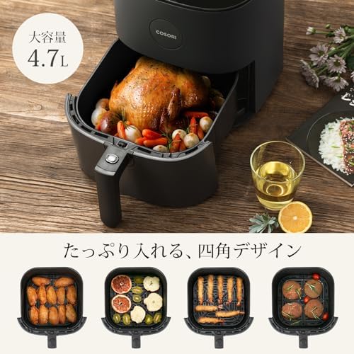 【時短調理】食材をバスケットに入れ、温度と時間を設定するだけで自動的に調理できます!フライパンを使った調理と違い、調理中に目を離しても大丈夫です。一度にたくさんの料理を作ることができるので、年末年始でいろいろとお忙しこの時期、食事の準備から解放されましょう。 【おうちで本格的な肉料理を楽しもう】COSORIの独自技術により、最高230℃までの温度設定が可能になります。これにより、お肉に最適な温度で調理ができます。高温で調理されたお肉は、外側がキレイに焼きあがり、中は柔らかくジューシーな食感を楽しめます。 【約85%の油分カット】アップグレードされた360°熱風循環技術により、ノンオイルでの調理が可能になります。通常の電気フライヤーやオーブンよりも、油分を約85%カットすることができます。あっさりとした食感は夏にもぴったりですし、ダイエット中や体型を管理したい時でも安心して揚げ物を楽しめます。 【4.7Lの大容量でコンパクト】家族3~5人分の食事を作ることができる4.7Lの大容量機種ですが、従来のフライヤーと比べてもよりコンパクトになっています。そのため、場所をとらず、収納も簡単です。さらに、円形のバスケットよりも食材をたくさん入れられる四角形のバスケットも特徴の一つです。 【豊富な調理モード】高級感のあるタッチパネルで簡単に操作できます。鶏肉、ポテト、冷凍食品、ステーキ、魚、野菜、ベーコンなど、9種類のプリセットが用意されています。調理時間は最大60分まで設定でき、温度は最大230℃まで調整できます。当ページでは取扱説明書(ユーザーマニュアル)と特製専用レシピ(ユーザーガイド)をダウンロードできますので、ぜひご活用ください。家族や友人へのプレゼントとしてもおすすめです。 【お手入れが簡単】油処理が必要なく、油煙や油滴、匂いともおさらば!キッチンをいつでもキレイに保つことができます。バスケットも食洗機対応しているため、日々の食生活に大活躍します。 【調理器具の別売り】①COSORIエアフライヤー用紙(100枚セット):焦げ付きを防止してくれる上に使い捨てなので、掃除不要!購入検索キーワードは「B0BY8CJCM2」です。②調理器具6個セット:ケーキやピザ、串揚げなど、様々な料理が楽に作れる料理の相棒。食洗機にも対応しているので、お掃除も楽々です。購入検索キーワードは「B09BMWPXSJ」です。 【グローバルブランド!2年保証・充実なサポート】①COSORIはアメリカで創業し、アメリカ、ドイツ、カナダを含む9カ国で販売されている人気ブランドで、東京にも事務所がございます。既に三千万以上のお客様にヘルシーかつ美味しい食生活をさせていただきました。②製品に2年間の保証期間と24時間以内の日本語サポートを提供致します。面倒な手続きが一切なく、何かご不明や不具合がございましたら、お気軽に弊社までご連絡ください。