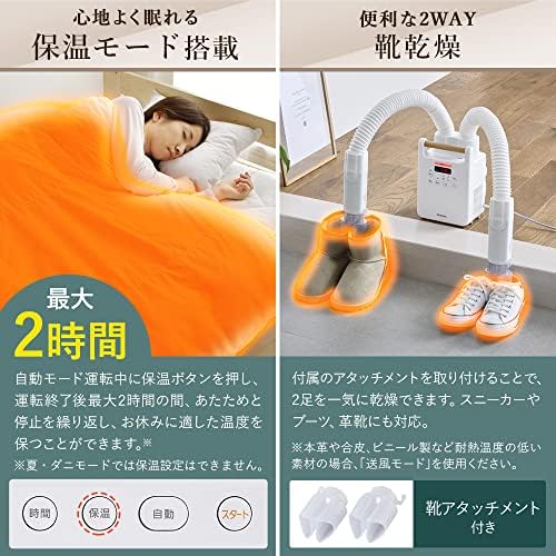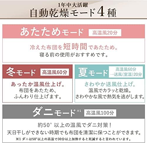 Amazonマーケットプレイス保証は、出品者が販売および発送する商品をご購入の場合に適用されます。Amazonマーケットプレイス保証は、購入された商品のコンディションや配送を保証するものです。 Amazonマーケットプレイス保証は、出品者が販売および発送する商品をご購入の場合に適用されます。Amazonマーケットプレイス保証は、購入された商品のコンディションや配送を保証するものです。 温風でふとんをあたため、湿気とカラリととばす「カラリエ」。 ツインノズルだから2つの布団も一気に同時あたため&乾燥! シンプルでオシャレ、デザイン性UP。 フラットなパネルはシンプルで操作がしやすい。 取っ手が木目調で、インテリアに馴染む。 立体ノズルにサイドフラップが付くことで安定感がUP。 立体型フラップが布団の中で大きな空間を作り、隅々まで風を届けます。 立体ノズルとツインノズルで2枚の布団を一気にあたため。 心地よく眠れる「保温モード」搭載。 自動モードの冬またはあたための運転終了後、間欠運転を2時間繰り返し、お休みに適した温度を保つことができます。 1年中大活躍、自動乾燥モード4種。 あたためモード、冬モード、夏モード、ダニモードでオールシーズン快適な布団に。 風を3段階使い分ける。 高温・低温:2種類の温風で、好みや状況に応じて使い分けられます。 送風:風を送り熱気を取り除きます。 8段階でタイマーを設定できます。 15分から180分まで設定可能。 タイマーが0になると自動で運転を停止します。