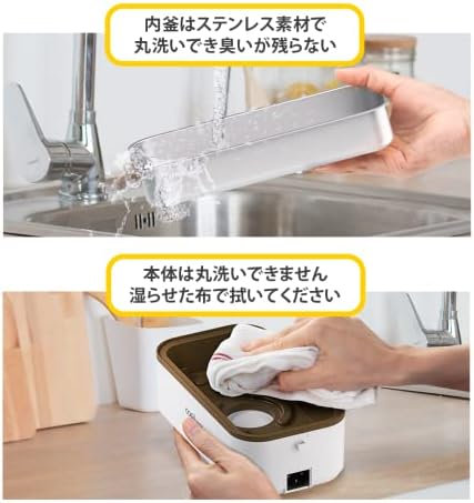 【1台4役&同時調理】cosi home の弁当箱炊飯器は、炊飯器・加熱・蒸し・ランチボックスの4つの機能が集約されています。下段でお米を炊きながら上段でおかずを同時に調理できます。冷凍食品やレトルトカレーを温めたり、炊き込みご飯や茶碗蒸しなどを作ったり、様々なレシピをお楽しみください。単層のみで使用することも可能です。一人暮らしの方やキャンプでの使用などにも最適です。 【360度の蒸気構造&高速調理】360度循環する蒸気が、効率よくまんべんなく中の食材に熱を加えます。旨味や栄養を逃がすことなく食材本来の良さを引き立たせ、白米はふっくらとした甘みのある炊きたてのご飯が出来上がります。お米の炊き時間は、0.5合の場合約20分、1合の場合は約25分であっという間に炊き上がります。 【簡単操作&安全設計】ミニ炊飯器の操作ボタンは1つのみ。お米と水とおかずを入れ、スイッチを押すだけで簡単にどなたでも調理頂けます。空炊き防止機能がついており、本体ベースの水が無くなると電源が自動でオフになります。また、日本の食品安全基準を満たしており安心してお使い頂けます。 【らくらくお手入れ&持ち運びに便利】ステンレス製の容器は汚れや臭いが残りにくい素材になっています。丸洗いでき常に清潔な状態を保つことが出来ます。本体ベース部分は丸洗いできませんので湿らせた柔らかい布でお手入れをしてください。電気弁当箱の両サイドに固定ロックがついており、持ち運びに便利な取っ手もついています。日常使いはもちろん、オフィスやアウトドアでも大活躍します。 【安心のメーカー保証】日本語取扱説明書が付属しています。また、購入より1年間有効なメーカー保証がついておりますので安心してご購入・操作頂けます。万が一製品に不具合等が見られましたら、「注文履歴」→「出品者に連絡する」から弊社宛にご連絡ください。日本語で迅速に対応致します。