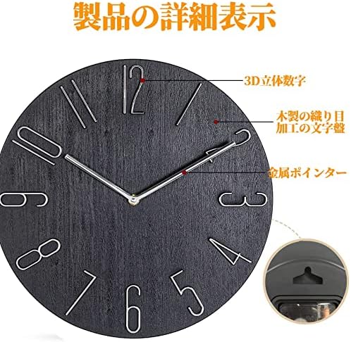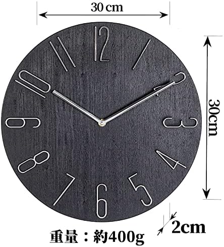 【壁掛け時計 仕様】:サイズ:直径30㎝、厚さ2㎝ ,重量:約400g,材質:ABS,電池:単3形電池1本(マンガン電池)(別売り)。 【オシャレ部屋飾り】:オープンタイプでガラスなし木目調文字盤の掛け時計です。シンプルな文字盤に凸凹な3D立体数字の視認性が高くて、遠くからもはっきり見え、時間が分かりやすいです。 【静音 掛け時計】:高品質のスイープムーブメントを採用して、秒針無しのデザインでカチカチという騒がしい音がないです。静かにとても落ち着いた雰囲気を演出できます。就寝時や読書時など、時計の音が気になる方にもおすすめです。 【実用性高く】:北欧風静音タイプの非電波掛け時計が部屋、キッチン、リビング、玄関、ベッドルーム、居間、書斎、図書館、オフィスなど、様々な場所にふさわしい。引越し祝い、新築祝い、休日の贈り物(誕生日、結婚式の贈り物など)また家のインテリア、部屋飾りなどもおすすめします。 【ご注意】:万が一商品の不具合や破損等ございましたら、無償で交換対応させていただきますので、お手数ですが、弊社までメールにてご連絡頂きますようお願い致します。