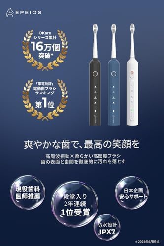 「家電批評」2023年連続ベストバイ一位受賞(二年連続) 殿堂入り電動歯ブラシ エペイオス(Epeios) 音波歯ブラシ ソニック 歯ブラシ 電動 ブラシヘッド2本 IPX7 防水 歯磨き Type-C 充電式 180日間使用 誕生日 ギフト プレゼント