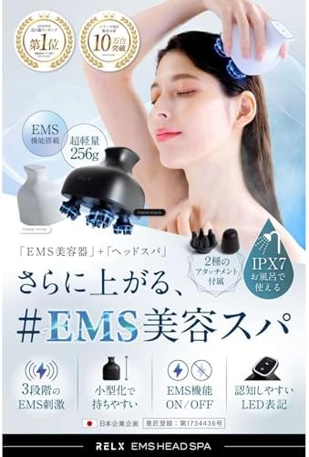 ✅【プロの技術を再現したRELX(リラクス) EMS本格ヘッドスパ】プロの「つまみあげ」「つかみ揉み」の技術を再現し、まるでヘッドスパを受けているような心地いい頭皮エステをおうちで体感。 硬く固まった頭皮とその汚れにアプローチ。濡れた髪、乾いた髪、首・肩・気になるボディの曲線部分にしっかりフィットします。 IPX7防水仕様なのでお風呂でリラックスしながらお使いいただけます。テレビを見ながらドライスパ、全身のケアにもおすすめです。 ✅【新たにEMSモード搭載し、より小型・軽量感を追求した設計】EMS/ノーマルモードから選択可能。既存のRELXヘッドスパよりさらに小さく、フィットしやすいカタチと軽量感に。 充実した機能性とインテリアに馴染むシンプルなデザインがプレゼントにも最適です。 ✅【用途によって使い分ける2種類のアタッチメント】 (EMS用)地肌を整えながらブラシ先端の低周波刺激がピンポイントに集中的にアプローチ。原料からこだわり何度も微調整し開発された「色落ちしないEMS通電アタッチメント」は、RELX独自企画です。 (フェイス用)よりお肌に優しいシリコンを採用。まるでヘッドスパニストの指かと思わす柔らかさと弾力性。お肌に触れた時の刺激を軽減した当社オリジナルアタッチメントです。それぞれのアタッチメントをぜひ体感してみてください。 ✅【簡単操作3STEP】 1、使用する部位を水/化粧水で湿らせる。(EMSは水を通じて伝わる仕組みです) 2、電源ボタンを長押しで、本体が起動。EMSを使用する場合は、EMSボタンを押す。 ※必ずアタッチメントは、EMS通電ブラシを使用する。 3、回転スピードを変更するには、さらに電源ボタンを短く押す。(3段階あり) 10分間のリラクゼーションをお楽しみください。 ※長時間の使用を防ぐため、10分経過すると自動で電源がOFFになります。途中で終了したい場合は電源ボタンを長押し(約2秒)してください。【フル充電時間】約2.5時間【使用時間】約2時間 ✅【保証書とセット内容】本体・充電台・2種類のアタッチメント・USB充電コード・取扱説明書(保証書付き) 【保証について】保証はお買い上げ日より6ヵ月です。修理・交換の際には保証書の提示が必要となりますので大切に保管してください。 本体のみ防水仕様なので充電する際、充電台は水まわりや湿気のある場所を避けて充電してください。 ※本商品にはACアダプターは付属されておりません。充電時には、定格電源DC:5V−1A以下のものをご使用ください。※スマートフォンなどの急速充電は出力が強すぎる場合があります。(電源が入らなくなる等の故障の原因になります。) ※定格電源DC:5V-1A以外のものをお使いになられて故障した場合、保証期間内でも保証対象外となります。 【注意事項】植毛や部分かつら(エクステンションを含む編み込みなど)を使用されている方はご使用いただけません。型番:EX08B ※発注ロットにより型番が異なる場合がございます。