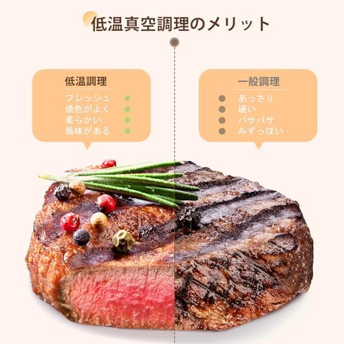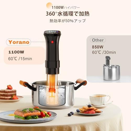 【低温調理 最上級クラスの料理を味わう】低温調理器を使うことで、火加減がコントロールしにくい食材を一定の温度で加熱させることが可能。なお、多様なレシピがつくことで、たとえ料理に苦手な方が使ってもミシュランの星を獲得したレストランのシェフのようなパフォーマンスが再現できる。低温調理法は食材の元の味を引き出せる秘訣である。肉の水分を保つ上、肉質をさらにやわらかくすることで、豊かな風味が味わえる。 【1100Wハイパワー 360°水循環で加熱】1100Wをもつ、ハイパワーのYorano低温調理器具は850Wの真空調理器よりも予熱効率が高く、大きいサイズの食材でも十分に加熱することができる。360°水循環で加熱によって全方位で均一的に加熱することが実現される。また食材の栄養価を破壊せず、フレッシュな食感も保てる。 【24時間タイマー予約 時間と温度をコントロール】「タイム設定」を長押ししてタイマー予約機能に入ります。予約設定が完了すると、低温調理機が自動的に起動する。就寝前や出勤前に予約をして、起床後や帰宅時にすぐ食べられる。従来の調理では、火加減を把握するために常に注意を払う必要がある。この低温調理機には、スマートメタル温度センサーが搭載されて、過度調理の心配を気にせず、精確な時間に正確な温度で加熱してくれる。焦げる心配もなく、最大限食材の栄養素と風味を保留できる。 *温度設定は25 - 95℃まで、精度は±0.1°Cとなる。  時間設定は1分刻みで、0時間 - 99時間になる。 【可調整プレスタイプクリップ 使いやすさ】プレスタイプクリップに滑り止めシリコンパッドを加えて、より安定して脱落しにくい低温調理器でき上がる。 3段階可調整によって、高さが異なる調理容器を使っても簡単に対応可能。ネジで固定されるタイプの調理器より手間が省ける。 精密調理器を任意の鍋や容器に取り付け、鍋や容器に水を入れ、密封された袋に食べ物を入れ、タッチパネル操作で料理を応じて温度と時間を設定して「ほっとく」時間を待つだけ。 【 五重安心保護 1年間保証】安心安全な商品を供給することが一番重要な使命である。低温調理器の防水レベルはIPX7にたどり、お料理中や使用後のお手入れの際に、多少水がかかっても安心できる。また、本製品は燃焼防止センサー、温度センサー、水位感知センサー、110℃高温防止センサーが四つも搭載されて、保証期間は12カ月間になる。 *ご不明な点や万が一の不具合などが発生した場合は、当店までご連絡いただきますようお願い申し上げます。その際は、速やかに対応させていただきます。