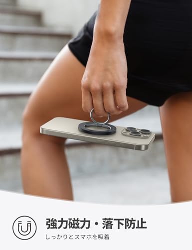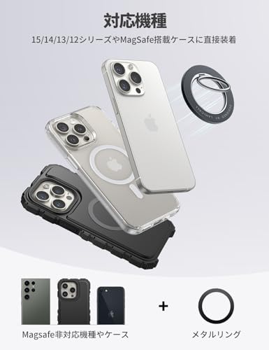 🧲【対応機種】iPhone 2023, iPhone 15 15Plus 15Pro 15Pro Max, iPhone 14, 14pro, 14pro max, 14Plus, iPhone 13, 13 Pro, 13 Pro Max, 13 mini, iphone 12, 12 Pro, 12 Pro Max, 12 miniの本体やMagSafe搭載ケースに直接装着可能です。付属されたメタルリングを利用すると、磁力がもっと強くなります。 🧲【付属のメタルリング貼り付けたら利用できる機種とケース】Samsung Galaxy, LG, Sony Xperia, HUWEI, XiaomiなどのAndroidスマホで、本品は強力な粘着力があるメタルリングが添付されます。AndroidスマホやMagSafe非対応ケースもメタルリングを貼り付けたら、本品を使用できます。マグセーフリングを取り外すだけで、充電できます。メタルリングを利用した場合でも熱くなりませんが、ご安心ください。 【❗❗ご注意】回転部をスムーズに回転できますために、持つ時にゆるゆるの感じがあります。画像6のような二つの姿勢で置けば、卓上スタンド機能に影響しません。また、メタルリングをしっかり貼り付けることを確保するために、24時間後ご使用ください。また、メタルリングを利用する場合は、磁力が強くなります。正面から引き抜くとメタルリングも取り外す恐れがありますので、横から抜いてください。 🧲【強力磁力でしっかりと吸着】約1000gまでの荷重に耐える強力磁力です。iPhone 15/14/1313/12 シリーズをしっかりと吸着できます。マグネット式スマホリングで、iPhone MagSafe シリーズ本体やMagSafe搭載ケースに簡単に装着できます。また、マグネットなので跡を残さず取り外し可能です。テープ跡や糊残りを気にせずお使いのスマホをきれいな状態でご利用いただけます。 🧲【スムーズに360度回転可能】このバンカーリングは回転可能な内部リンクが設置され、装着したままでスムーズに360度回転機能を実現します。90度反転・360度回転の仕様で、スマホの持ち直しが自由自在。卓上スタンドとしても活躍しています。回転部をスムーズに回転できますために、持つときにゆるゆるの感じがあります。画像6のような二つの姿勢で置けば、卓上スタンド機能に影響しません。 🧲【落下防止・片手操作】リングに指を通して持つことで落下防止に役立つ。また、画面に触れる範囲が広くなり、片手操作が楽になります。 🧲【カメラレンズのキズ防止】このマグセーフリングの厚さは4.5mmで、スマホを卓上に水平に置いてもスマホのレンズにぶつからないです。ケースを装着しなくても、スマホレンズに傷がつく心配がありません。 【❗❗梱包について】この製品はどの色でも、箱の画像は白色の商品の画像を使用しています。ご注意ください。