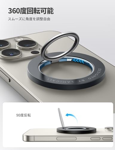Lamicall MagSafe対応 360度回転式 スマホリング : マグネット式 携帯電話 ホルダー リング マグセーフ バンカーリング 角度調整 スタンド 磁気増強 メタルリング付き 取り外し Magnetic Phone Grip iPhone 2023 iPhone 15 15 Plus 15 pro 15 pro max iphone 14/13/12 Android に対応 ブラック