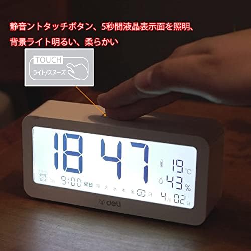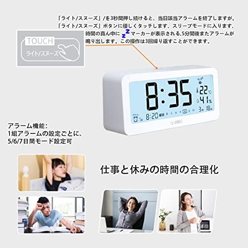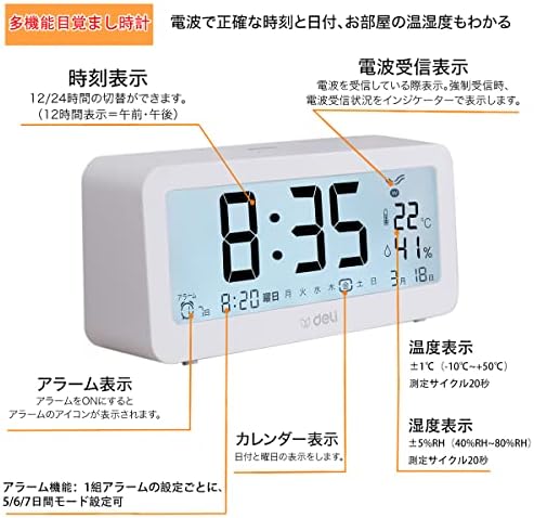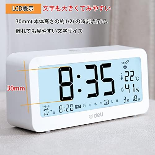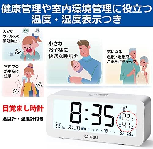Deli 目覚まし時計 電波時計 メーカー2年保証 文字も大きくてみやすい 乾電池式 画面が明る 温度計・湿度計付き 多機能デジタル時計 静音 スヌーズ機能 コンパクトでシンプル ファッショナブルな外観 簡単な操作で 置き時計(14.6cm,白)