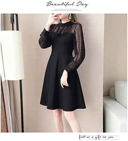 [Collecala] ワンピース レディースロング長袖ドレス ドットフロッキープリント クルーネック 肩透けセクシーワンピース 膝丈 Aライン 結婚式パーティードレス 通勤 二次会 結婚式