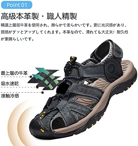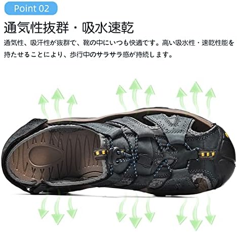 【上質な牛革を精選する】通気性を重視ため、アッパーは水や汚れに強い牛革を採用し、排水でき、蒸れにくく通気性が優れ。本革の味が出る感じが楽しめるといいかなと思っています。この夏はこの1足のサンダルで十分に快適になります。 【通気・抗菌】通気性、吸汗性が抜群で、靴の中にいつも快適です。ばい菌の繁殖にも的に抑えられ、足が臭くなりにくく、足汗が多い方、蒸し暑いに弱い方、足が敏感な方にぜひおすすめです。また、天然革製は抗菌性があり、足が臭くなりにくく。 【つま先保護設計】アウトソールの素材がつま先部分にも覆われて保護性や耐久性もアップする。スポーツ、登山やハイキングなどのアウトドアアクティブに足先をしっかり守る。アウトドア、運動、普段着に最適です。 【耐衝撃・防滑・歩きやすい】濡れた山道などでも滑りにくいラバーのアウトソールを採用。高いグリップ力で快適な歩行性をキープしてくれるので、山以外にもビーチなどで活躍するはず。程良い柔らかさのソールが衝撃を吸収し足の負担を軽減。 【様々なシーンで活躍】まるでスニーカーの様な歩きやすさ。それでいて、長時間でも蒸れないので、春~秋のウォーキングに最適。キャンプ、フェス、川や海などの水辺でのアウトドアから、毎日の散歩や、雨の日のお出かけなど、数多くのシーンで活躍する。 - 2,961位ファッション ( ) - 31位