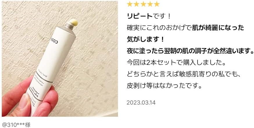 ●《肌年齢を戻してより若く!》本物の純粋レチノール0.1%含有で実際変わってくるお肌の変化をご体験ください。 ●《敏感なお肌の方も安心!》ニキビ肌への使用適合テスト、ノンコメドジェニックテスト済みでニキビ肌の方も安心! ●《偽レチノールにはもうだまされないでください!》レチノール誘導体ではない、本物の純粋レチノールで本当の効果をご実感ください。 ●《4つの人体適用テスト完了!》4種類の人体適用テストで立証された安全な成分で2歳も若くなる肌年齢! ●《純粋レチノール成分を守る特殊制作容器使用》光、熱、酸素に弱いレチノール成分を安定的に保つためにアルミの特殊容器を使用しております。