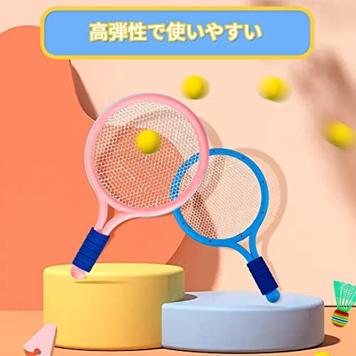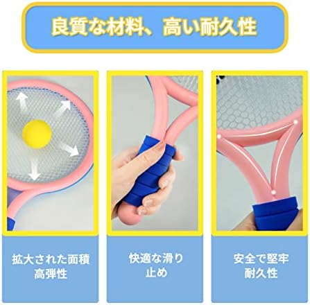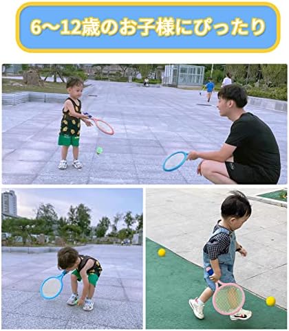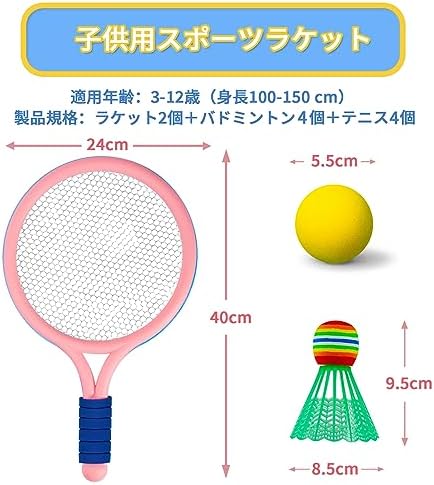 【コンパクトサイズ・6~12歳のお子様に最適】【パッケージ内容:バドミントンラケット*2+シャトル*4+EVA素材のテニスボール*4】縦40cm、横24cmの小型のラケットで、身長100cm~150cmの子どもに適しています。【二種類の遊びに対応した球が付属】バドミントン用のシャトルとEVA素材のテニスボールが付属しています。 【軽量で子どもに優しい】ラケット一本の重量はわずか70gなので子どもでもストレスなく使えます。子どもはまだ骨の発達が完全ではないので、大人用のラケットを無理に使わせないようにしましょう。 【高耐久のネット、壊れにくい柔軟な素材を使用】ラケットと一体化したネットは頑丈に作られており、長く使っても縫い目の緩みや剥がれがなく、壊れにくくできています。【壊れにくい柔軟な素材を使用】耐久性のあるPVC+EVA素材を使用しており、金属製のラケットより軽く、また衝撃で変形することがありません。子どもにより使いやすい設計になっています。 【高弾性でよく飛ぶ】高弾性のネットですので、力のない子どもでも使いやすく簡単にテニスやバドミントンを楽しむことができます。 【事故を防ぐ快適なグリップ】グリップ部にはすっぽ抜け等の事故を防ぐため滑り止めを施した握りやすい保護カバーが取り付けられています。 【親子で楽しめる】子どもでも使える本製品を使うことで子どもが運動する楽しさをより実感できるとともに、全身運動により身体の成長を促します。また親子で一緒に楽しめるので、子どもとの思い出作りにも役立ちます。【子どもへのプレゼントに最適】誕生日、入学シーズン、クリスマス、夏休みなどでの子どもへのプレゼントに最適です。学校、公園、キャンプ場などで家族やお友達などと一緒に遊ぶことができます。
