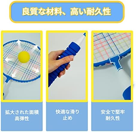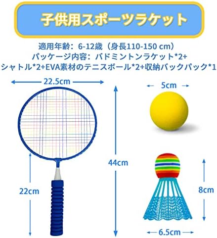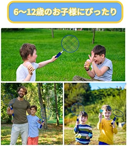 【コンパクトサイズ・6~12歳のお子様に最適】縦44cm、横22.5cmの小型のラケットで、身長110cm~150cmの子どもに適しています。【二種類の遊びに対応した球が付属】バドミントン用のシャトルとEVA素材のテニスボールが付属しています。 【軽量で子どもに優しい】ラケット一本の重量はわずか100gなので子どもでもストレスなく使えます。子どもはまだ骨の発達が完全ではないので、大人用のラケットを無理に使わせないようにしましょう。 【高耐久のネット、軽量で耐久性に優れたアルミニウム合金フレーム】ネットは頑丈に作られており、長く使っても縫い目の緩みや剥がれがなく、壊れにくくできています。【アルミニウム合金フレーム】耐久性のあるアルミニウム合金素材を使用しており、その他のラケットより軽く、軽量と耐久性の2つの特長を兼ね備えている。子どもにより使いやすい設計になっています。 【高弾性でよく飛ぶ】高弾性のネットですので、力のない子どもでも使いやすく簡単にテニスやバドミントンを楽しむことができます。 【事故を防ぐ快適なグリップ】グリップ部にはすっぽ抜け等の事故を防ぐため滑り止めを施した握りやすい保護カバーが取り付けられています。 【親子で楽しめる】子どもでも使える本製品を使うことで子どもが運動する楽しさをより実感できるとともに、全身運動により身体の成長を促します。また親子で一緒に楽しめるので、子どもとの思い出作りにも役立ちます。【子どもへのプレゼントに最適】誕生日、入学シーズン、クリスマス、夏休みなどでの子どもへのプレゼントに最適です。学校、公園、キャンプ場などで家族やお友達などと一緒に遊ぶことができます。