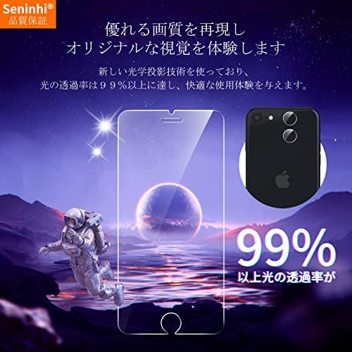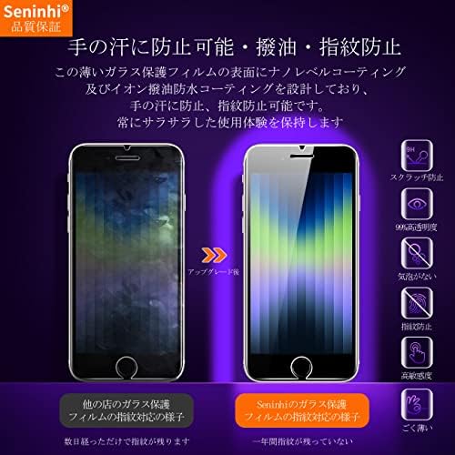 ☞【専用設計】iPhone SE2 iPhone SE3 iPhone8 iPhone7 専用に設計した 保護フィルム なので、必ずご購入前にお使いの携帯電話の機種をご確認ください。【正規品保証】Seninhi ブランドは 10 年間携帯電話保護フィルムの製造しており、最高品質の保護フィルムを生産することを約束します。市販の高価な保護フィルムと同じですが、価格がもっと安いので、お客様に大変ご愛顧いただき、月間販売数は20,000枚を超えました。弊社の製品は購入価値があります。安心して当社の製品をお買い求めください。 ☞【国産AGC旭硝子ガラス 素材】携帯フィルム及びレンズ保護フィルムは国産AGC旭硝子ガラスを使っており、4.5時間の高温焼入れ処理して、強化を繰り返し、硬さは業界トップレベルの9Hに達しました。市販の通常製品の5倍の硬さに達し、ナイフなどの鋭いものでも傷しません。ハードコーティング技術を利用して、外部衝撃を吸収し、防爆性をアップして、外からの衝撃に簡単に吸収して、衝突されても、画面が壊れるリスクを 99% 減らします。更に iPhoneSE2 専用の強化ガラスフィルムは飛散防止加工を行っておりますので、万が一ガラスが割れても怪我を与えません。 ☞【簡単に貼り付け】 iPhoneSE2 iPhoneSE3 保護フィルムの粘着面は自動吸着できるので、ガラスフィルムを携帯電話の画面に合わせるだけで自然に吸着し、しかも気泡の発生しません。誰でも簡単に貼れます。フィルム貼り苦手な方におすすめです。 【防水・油防止・指紋防止】 ガラスフィルム の表面にナノコーティングとイオン性撥油防水コーティングしており、通常のフィルムのようなザラザラ触り感じが一切ありません。更に超指紋防止、汗防止、ビデオ干渉防止などの特徴を備えており、ゲームする場合に、持続感と爽快感などの優れる点があります。指紋が付いても簡単に拭いてきれいになります。 ☞【指紋防止・高感度】 iPhone se3 強化ガラス se2 の表面は指紋防止コーティング加工を施して、画面がさらさらで指紋が付きにくい、高感度で快適な操作を実現。万が一汚れが付いても布で拭くときれいになります。 ☞【ラウンドエッジ加工】真空メッキプロセスを使用し、正しい丸みをエッジ処理して、不快感がありません。しかもエッジ部分へ衝撃が少なく、快適で滑らかな肌触りを提供する同時に、使用中に鋭い角のエッジで指を傷されません。 【市場に出回っている99%の携帯電話ケースに対応】 強化ガラスのサイズは携帯ケースを取り付けるために、十分なスペースがあり、両側が浮き上がりません。何百もの携帯電話ケースをテストしました。99%の携帯ケースに対応して、心配がありません。 ☞【透明度99%】 新しくアップグレードした光学プロジェクション技術を使用して、より高い光透過率があり、超クリアな視覚体験を与えます。裸画面の視覚感があるので、映画を見るか、ドラマを見ても、効果は非常に優れます。 ☞【品質保証】 Seninhiはお客様に安心できるカスタマーサービスを目指し、商品を発送する前に一枚一枚真剣にチェックしてから、すべて問題がないと確認した上で商品を発送します。 【アフターサービス】お買い上げ日より180日以内に初期不良やヒビ、不備、ゴミ混入、サイズ違い等の使用上の問題がございましたら、ご遠慮なく、いつでもお気軽にご連絡ください。私たちはお客様に満足できる返事を与えます。