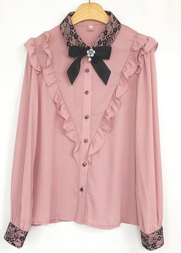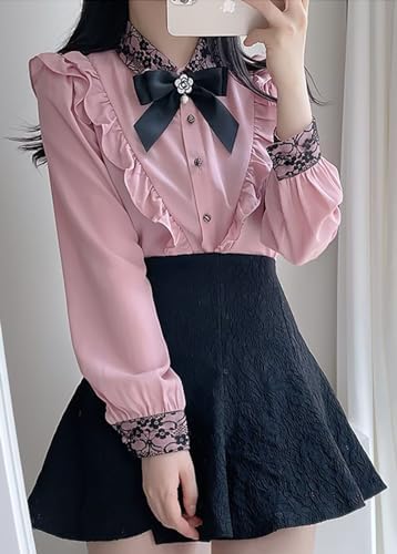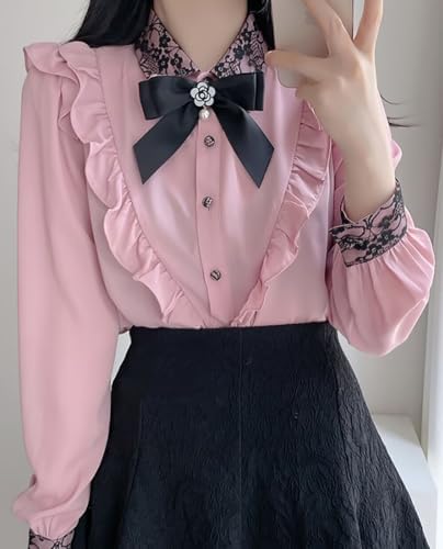 [YoniStar] 地雷系 量産型 ブラウス 服 地雷 レディース 地雷服 ピンク ロリータ トップス 長袖 リボンブラウス 量産服 かわいい ボウタイ レース フリルブラウス