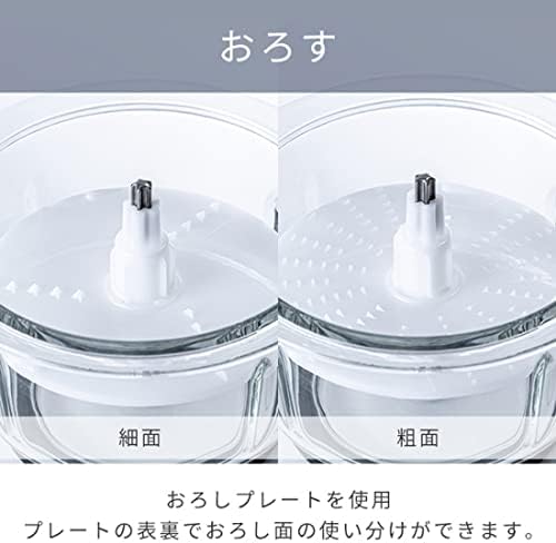 【1台4役】「刻む」「混ぜる」「おろす」「練る」がこれ1台、4wayで使えるフードプロセッサー。ハンバーグや大根おろし、ペースト作りなど、料理の下ごしらえをスピーディにお手伝いします。 【刻みカッター】玉ねぎやニンジンなど野菜のみじん切り、ハンバーグや餃子のタネづくり、ピーナッツペーストなどを調理できます。 【おろしプレート】大根おろしやとろろがあっという間に完成。プレートを反転することで、「細面」と「粗面」を使い分けることができます。 【すっきり収納】ふたの裏側に収納ホルダーがあり、おろしプレートやヘラ、プレート軸を収納できます。付属品も本体とまとめて収納できるので、紛失の心配もありません。 【商品仕様】◇本体サイズ:幅22.5×奥行14.5×高さ19.5cm ◇本体重量:1.5kg ◇電源:100V(50/60Hz) ◇消費電力:200W ◇定格時間:3分以内(3分使用ごとに20分以上休止) ◇最大調理容量:500g(ハンバーグの場合) ◇電源コード長:1.2m ◇回転数:2500回/分 ◇安全装置:温度ヒューズ、安全スイッチ ◇保証期間:お買い上げ日より1年間(保証の範囲については、取扱説明書をご確認ください。(一般家庭用以外(業務用など)に使用された場合の故障及び損傷などは保証対象外となります))