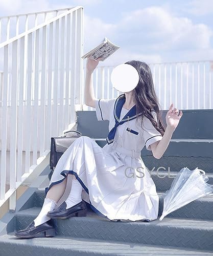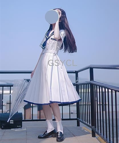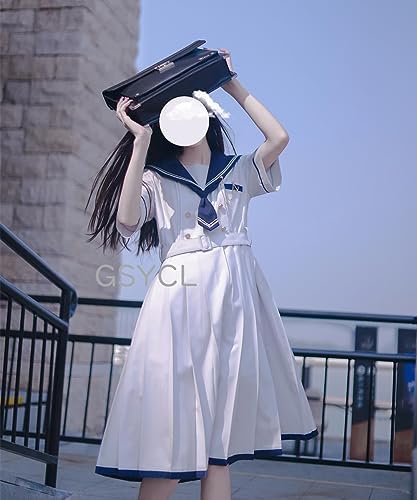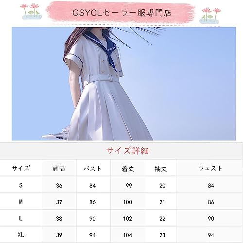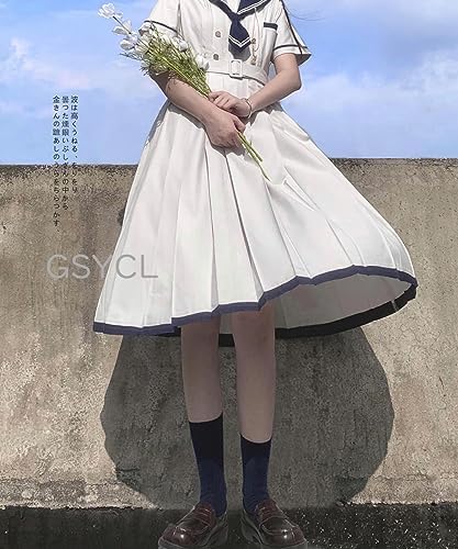 [GSYCL] セーラー服 ワンピース 半袖 紺色 ホワイト 女子高生 3点セット ハロウィン 衣装 JK 制服 コスチューム ロングスカート ネクタイ ベルト ボタン 女子制服 写真 撮影 文化祭 学园歳 卒業式 可愛い 森ガール