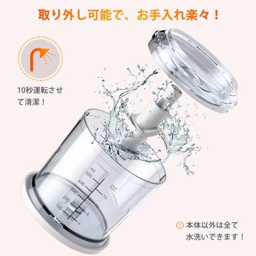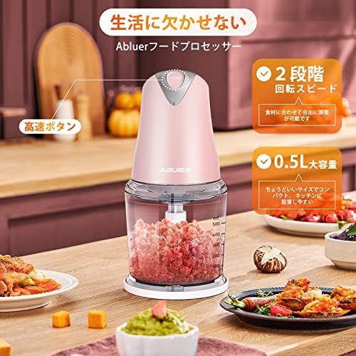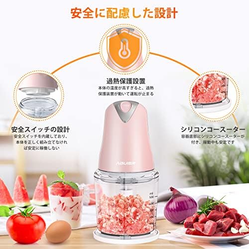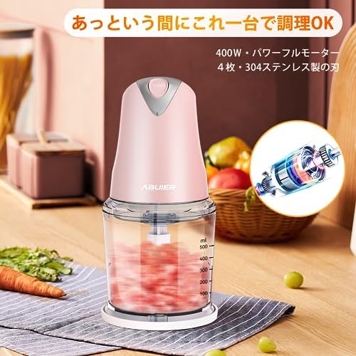 【🍛1台4役・料理の悩みを解決できた!】 料理が苦手な方でも簡単に使用できるAbluerフードプロセッサー。「刻む・砕く・つぶす・混ぜる」工程は、本製品1台があればスピーディーかつ簡単に!柔らかく炊いたかぼちゃやつまいものマッシュ、ほうれん草のスペート、 おかゆのすりつぶしなど手間がかかるメニューもサクッと完成できます!料理に合わせてさまざまな調理ができるのがポイントで、時間に追われるママやパパの頼もしいパートナーです。 【🕐400Wハイパワー、押すだけで瞬間に完成!】 400W高品質のモーターを搭載し、最大17250回/分の高速回転で、ハイパワーであっという間にみじん切りにできます。食材を入れたらスイッチ/本体を押すだけのシンプルな操作性が特徴です。ミンチ・みじん切り・すり身が簡単に調理できるため、餃子やつみれ汁など、さまざまなメニューに対応します。また、すっきりとコンパクトなデザインで置き場所に困らないのも魅力。容器はプラスチックでクリアなため、食材の様子を確認しながら作業ができます。さらに、本体以外の部品が丸洗いできて楽々です。 【🥩🥬2段階スピード、食材に合わせて自由調整!】 本製品の回転スピードは、硬めの食材を粉砕できる「高速」と、柔らかい食材を粉砕できる「低速」の2段階で調節可能。野菜・フルーツ・肉・卵など、硬さの異なる食材もスムーズに調理できます。 カッター刃はステンレス製を採用しているため錆びにくく、お手入れしやすいのがポイント。保護カバーが付いているため、取り外しの際も安心です。 【🧆毎日の料理が手早く、 手軽にランクアップ!】 本製品は鋭いプレードが上下に2枚ずつ、計4枚カッターを採用し、あっという間にこれ一台で調理できます。また、収納場所を取らないコンパクトなデザインとして、キッチンに設置しやすいです。大容量で食材が完全にカッターと合わせない従来型より、本製品は0.5Lの容器がでカッターにぴったりサイズで、しっかり食材と合わせてもっと切りやすいです。野菜はもちろん、肉、赤ちゃんの離乳食などの様々な食材を素早く粉砕し、豊富なお料理に活用できます。 誰でも手軽に毎日使いたくなり、初心者もぴったりです。 【🥰安全設計が3点、ご安心に使用!】 ①「安全スイッチの設計」安全スイッチを内蔵しており、本体と容器の蓋を正しく組み立てなければ安定に稼働しないでご了承ください。②「過熱保護設置」1回の連続使用時間は60秒で、断続的の使用をオススメします。長時間に運転したら本体の温度が高すぎると、過熱保護装置が動いて運転が止まります。③「滑り止めパッキン」容器底部にシリコンコースーターが付き、稼動中も安定です。また、1年の保証期間がつき、ご購入から初期不良,自然故障など、通常使用における保証対応させていただきます。