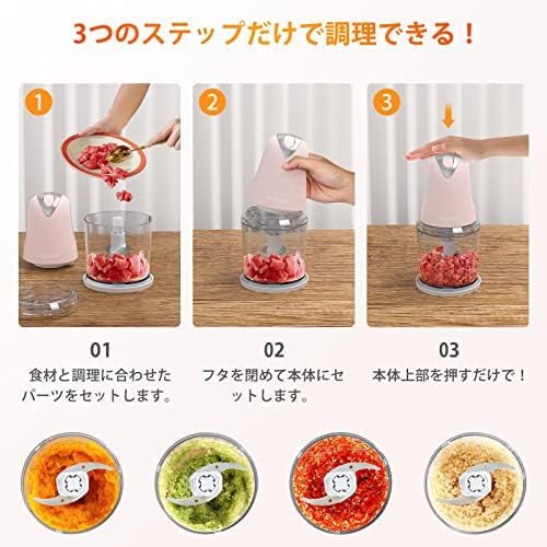 フードプロセッサー 1台4役(刻む/混ぜる/潰す/砕く) 400Wハイパワー 軽量コンパクトステンレス4枚刃 フードチョッパー 2段階スピード調節 チョッパー みじん切り 肉挽き/野菜切り/離乳食作り 500ml容量 省スペース 調理家電 コンパクト 軽量 使用簡単&お手入れ簡単 過熱保護 日本語取扱説明書 (pink)