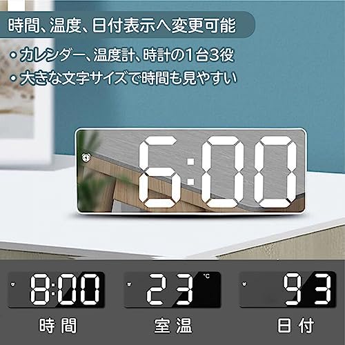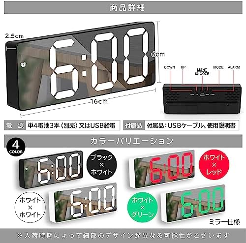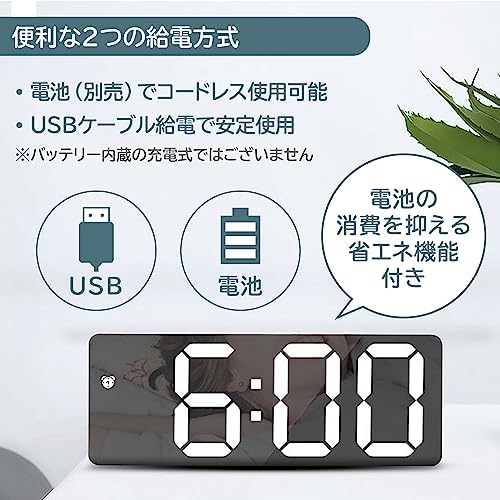 ✅大きなデジタル表示で、夜も見やすいLEDのデジタル目覚まし時計です。 ✅デジタルなので気になるカチカチ音もなく静音です。 ✅コンパクトでも見やすい多機能時計です。時間以外も日付、温度表示も可能。音感コントロールで文字盤が点灯(電池給電時のみ) ✅電池式、USB給電式の2種類の給電方法。電池式の場合には一定時間で自動消灯する省エネ仕様。 ✅付属品:USB給電ケーブル、日本語使用説明書 ✅注意事項:電池式は一定時間で自動消灯する仕様のため、常時表示させたい場合はUSBによる継続給電で御使用下さい。