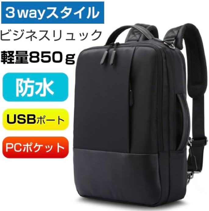 リュック ビジネスリュック 3way バックパック リュックサック 軽量 大容量 3way 防撥水 おしゃれ 斜めがけ 手提げ PCラップトップバック 多機能 USB充電ポート 通勤 出張 旅行 通学 メンズ 人気 入社 ブラック