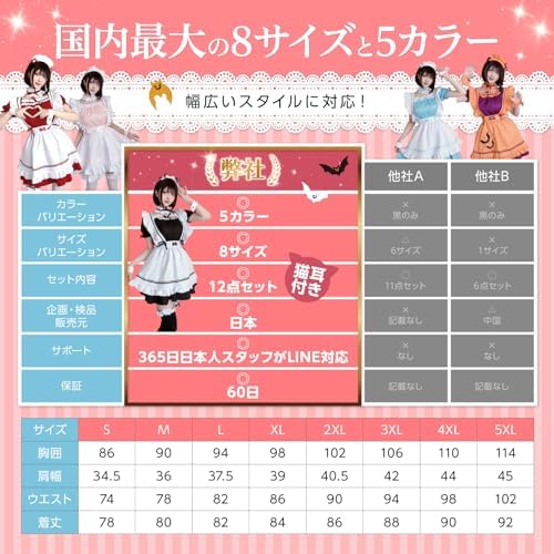 【豪華12点セット】ワンピース (黒)1点 エプロン (オレンジ)1点 パニエ (白)1点 カチューシャ 1点 チョーカー (首)1点 カフス (腕)2点 ガーターリング (片太もも)2点 ニーハイソックス (黒)1点 ニーハイソックス (黒レース)1点 猫耳1点 【サイズ】S・M・L・XL・2XL・3XL・4XL・5XL 【サイズの詳細は商品カタログページの表をご参照ください】 【各種イベントで活躍】 文化祭 学園祭 仮装パーティ ハロウィン コスプレ イベント クリスマス 、余興 女装 ステージ衣装 自撮り 撮影会 二次会 コンパニオン ガールズバー メイドカフェ 余興 女装 カフェ 制服 など 【洗濯】極力手洗いをお勧めします。洗濯機の場合はネットを使用し洗濯機での 脱水はせずに干してください。またアイロン掛けをお勧めします。 【素材】ポリエステル - 15,697位ホビー ( ) - 672位