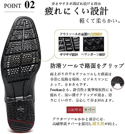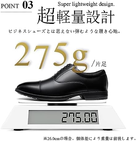 ★コスパ最高の革靴、アマゾンのビジネスシューズランキングで最も人気商品★当店オリジナル商品だからできる、コスパへのこだわり。工場と直接取引により、徹底的なコストカットを実現。 【走れるビジネスシューズ】素材を一から見直し作りこんだ圧倒的パフォーマンス。スニーカーのような履き心地に足あたりの良いアッパーは靴擦れしにくく仕上がりました。持った瞬間に気づく軽さも魅力で軽やかに歩き出せる事にきっと驚きます。※ランニング等を前提には作られておりません。 【疲れにくい設計のソール】クッション性と軽量感のあるEVAスポンジソールを採用、快適な歩行を実現。アウターソールかかと部分には、高耐摩耗ラバーを採用し耐久性が向上。 【優れた本革素材感】シワ止めの皮革を厳選しています、柔らかく足に馴染み、内羽根式の5つの穴で甲高の足にもフィットするトップラインとレザーとラバーのコンビネーションソールが特徴的。履き口、シュータン、ライニング(内貼り)には薄いスポンジのような素材を使用、履き始めの靴ズレのリスクを軽減、足当たりが良く快適に履いていただけます。 【あらゆるシーンで活躍】ビジネスシーンだけでなく、カジュアルな着こなしにも適しています。毎日の通勤・通学にはもちろん、卒業式、入学式、成人式、入社式、就活の面接、冠婚葬祭や式典などのフォーマルな場面のスーツスタイルに靴は必需品。 - 789位ファッション ( ) - 4位