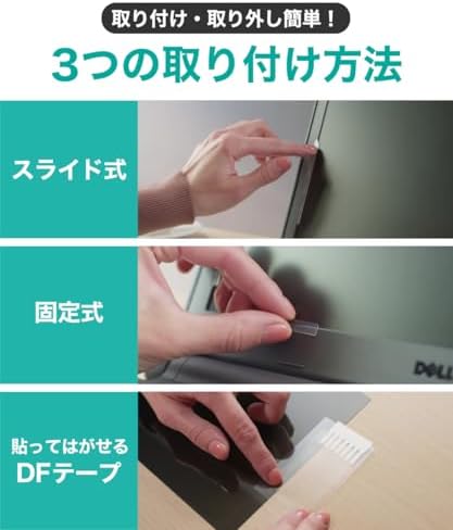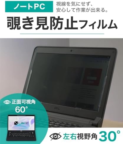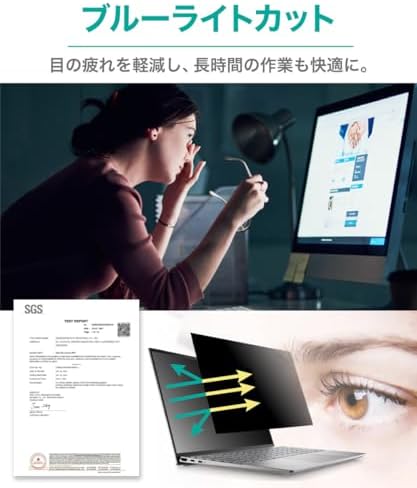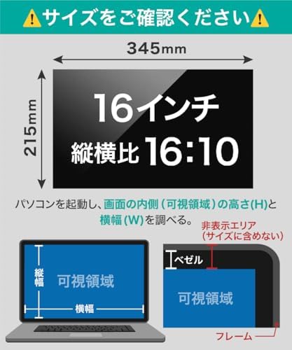 [ プライバシーフィルター ] 視野角 60度、正面から見れると画面はクリアでも、隣の席からは真っ暗に映る偏光性を有する「 覗き見防止フィルム 」です。 [ ブルーライトカット ] 私たちが子供の頃にはなかったノートパソコンのスクリーンから発せられる青色光。 毒性の強いブルーライトは眼精疲労や体内リズムへの影響が益々懸念されています。 本製品は覗見防止効果を有しながら、ブルーライトを約50%低減。将来のことを考えるならブルーライトカット対応の 覗き見防止フィルター がオススメです。AG面は反射率5.8%とアンチグレアで光の映り込みもほとんどありません。 [ リバーシブル ] 表面はマットな質感で反射が少なく蛍光灯の多い場所でも見やすいアンチグレア面(反射防止加工・非光沢)、 裏面は反射率が高くサイドからの覗き見防止効果が大きいグレア面(光沢)です。ご利用環境に合わせてご利用いただくことができます。 [ 装着方法 ] 画面に段差があるフレームベゼルタイプには<スライド式>または<ベゼル固定方式>を、段差のないフレームレスの液晶画面には<直張り方式>を推奨。 お持ちのパソコンに合わせて固定用プレートまたは両面シールを貼ってのぞき見防止フィルムをご利用ください。 [ フィルターサイズ ] 345x215mm ※注文前にお使いのパソコンの画面を測り、適切なサイズをお選びください。確認方法は商品画像2枚目参照のこと。[ 対応機種一例 ] ASUS用 エイスース用 Vivobook 16X M1603QA X1603ZA / DELL デル Inspiron 16 / HP エイチピー ENVY Laptop 16 / HUAWEI用 ファーウェイ用 MateBook D / Lenovo レノボ IdeaPad Gaming 370i Slim 570i Legion Pro 5i LOQ 16IRH8 ThinkPad E16 Gen 1 / MSI Vector-GP68HX / マウスコンピューター DAIV Z6 G-Tune P6 / LGエレクトロニクス LG gram +view 16MR70 16MQ70 など。詳しくは商品画像2枚目のサイズ確認方法をご参照ください。