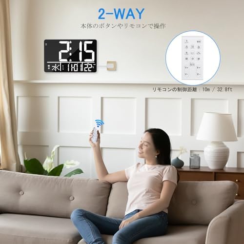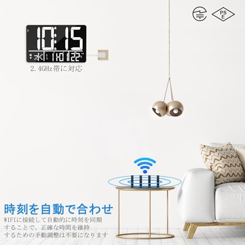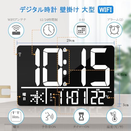【デジタル時計 WIFI】WIFI接続による自動時刻補正に対応し、時間の不正確さや頻繁な時刻調整の手間を心配する必要がありません。①WIFI自動時刻修正対応 ②℃/℉温度表示 ③12/24時間表示 ④カレンダー ⑤曜日表示 ⑥タイマー ⑦スヌーズ機能 ⑧メモリ機能、見やすくはっきりとした大きな数字は、どの角度からでも読むことができます。このデジタル時計は時間、曜日、温度、月と日付を表示し、明確で快適な視覚体験を提供します。壁掛けおよび置き型の両方に対応し、必要に応じて位置を自由に調整することができます(壁掛けフックと透明フックが付属しています)。 【TELEC認証&PSE電源】この大型時計はTELEC認証を取得しており、関連する技術および安全基準に準拠しています。この電源はPSE認証済みで、入力定格:100-240V、出力定格:12V=1000mAです。3メートルのケーブルが付属しており、長さ不足で取り付けができない心配はありません。この時計は電源を接続して使用する必要があり、電池の頻繁な交換の手間を省けます。 【LED数字表示&3つのモード】大型LEDディスプレイを搭載しており、時間を確認しやすくなっています。このデジタル時計には、タイマー、アラーム、時計の3つのモードがあります。リモコンを押すだけでモードを切り替えることができ、操作が簡単です。人間工学に基づいた設計で、12/24時間表示の切り替えや℃/℉の切り替えも行うことができ、お客様のニーズに応えます。 【スヌーズ&25種音声】Blueekinのデジタルカレンダー時計は、聞き取りやすい音声警報と正確な時間を提供し、信頼できる目覚まし時計のアシスタントです。目覚ましサービスを通じて、9分間のスヌーズ機能は非常に便利です。ユーザーは、25種音声のオプションから選択することができ、異なる気分やニーズに合わせて適切な選択をすることができます。 【タイマー&予告音】カウントダウンタイマーの設定範囲は0~99時間59分59秒です。カウントダウン終了後、約90秒間ピップ音が鳴ります。カウントダウン音声機能により、ユーザーに現在のタイマーの進行状況を即座に通知し、残り時間や経過時間を明確に理解できます。設定した時間になったら音声でユーザーに通知し、重要なタイミングのタスクを見逃さないようにします。【品質保証】ご購入日より1年間の品質保証を提供しています。初期不良の場合、交換または返金サービスを提供できます。製品に問題がある場合は、いつでもお気軽にご連絡ください。