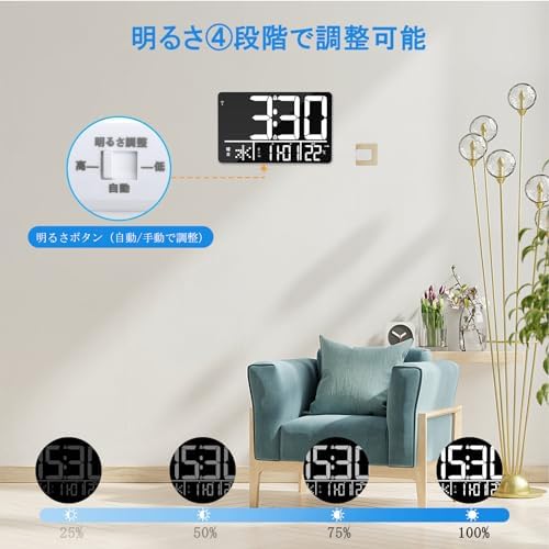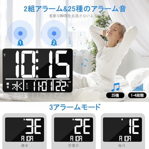 Blueekin デジタル時計 WiFi 自動時刻修正 電波 大型 13インチ 4段階調光 2組アラーム 25種音楽ベル 4段階音量調節 デジタルカレンダー スヌーズ タイマー 音声アナウンス 置き掛け兼用 12H/24H時間表示 温度付き