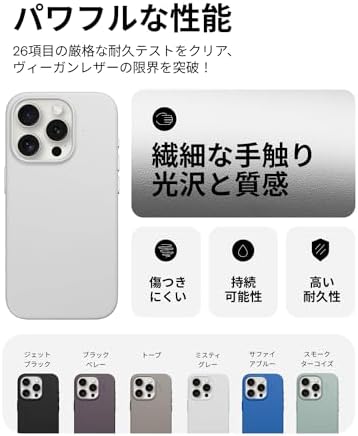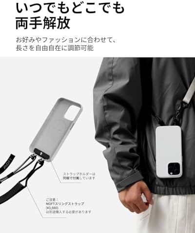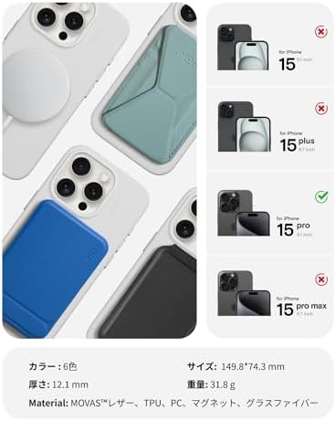 【MOVASの美しさ・繊細な手触り】MOVASはMOFT特製のヴィーガンレザーで、肌に馴染む柔らかな質感でありながら、非常に薄く、重さと厚さを軽減しています。色落ちがしにくいだけでなく、他の色がつきにくくなっていますので、デニムのポケットに入れておいても安心。心地よい光沢と質感をキープします。 【MOVASの強さ・優れた耐久性】MOVASは高耐久で汚れに強いのがもう一つの特徴です。うっかりつけてしまいがちなコーヒーや口紅などの汚れを簡単に落とすことができます。また、DMFを一切使用しておらず、環境にも人にも優しい素材です。 【MagSafe対応・アクセサリーと合わせて活用】MagSafe対応ですので、MOFT全シリーズのアクセサリーと合わせてお使いいただけます。あなたらしいカラーリングをお楽しみください。また、MOFTの「スリングストラップ」と一緒にお使いいただければ、毎日の通勤通学から、ペットの散歩、サイクリング、スケートボードまでより身軽に。 【全面保護・細部までも上質】高さ1.5mmのガードで、うっかりスマホを落としてしまってもレンズを傷から守ります。金属製の独立ボタンは反発感があり、快適な押し心地です。ケース内側に柔らかい裏地が携帯を包み込んで傷やスクラッチから携帯を守ります。 【機種対応・装着方法】iPhone 15 Proに対応します。装着方法:まずカメラレンズのある角からスマホをケースに差し込み、四角を順番に押し込みながらスマホ全体をケースにフィットさせます。