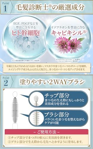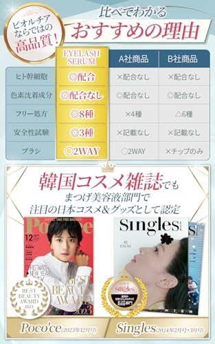 ビオルチア アイラッシュセラム(まつ毛美容液)内容量6ml 【毛髪診断士(R)と共同開発】毛髪診断士(R)と共同開発を行い、厳選成分を惜しみなく配合。イソフラボンを豊富に含有することで知られるキャピシキル(R)や、EGF、PDGFなどの成長因子を豊富に含有し、まつ毛に潤いを与えるヒト幹細胞を配合しました。まつ毛にハリ・コシを与え、より美しく魅力的なまつ毛ラインを作ります。 【天然由来成分94%、美容成分が99%の贅沢処方】さらに、ダメージを補修する2種類のケラチンやペプチド等の成分も配合。天然由来成分94%、美容成分が99%の贅沢処方で、まつ毛をより健やかで美しい状態に導きます。 【こだわりの2WAY形状でストレスフリーな塗り心地】チップ+スクリューブラシの2WAY形状を採用し、細かい部分にも塗布できるストレスフリーな塗り心地を実現。根本から毛先の細かい部分まで満遍なくケアが可能で、短いまつ毛にもジェル状の美容液がしっかりと密着します。また、眉毛のケアにもお使いいただけます。 【デリケートな目元だからこそ安心と品質を徹底】デリケートな目元だからこそ、無添加にこだわりました。安心と品質にこだわって、第三者機関での厳しい検査もクリア。目元への優しさを徹底した国内製造品です。 - 474位ビューティー ( ) - 1位